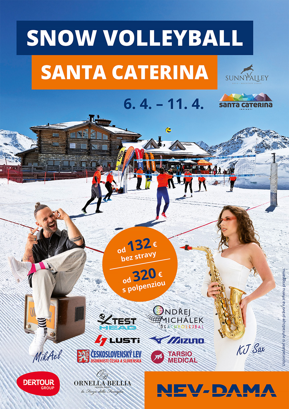 Už po šiestykrát pre vás organizujeme medzinárodný turnaj vo snow volleyballe. Prihláste sa a užite si volejbal na snehu vo výške 2 700 m n. m. pri krásnom resorte Sunny Valley v talianskom stredisku Santa Caterina. Môžete sa tešiť na koncert saxofonistky KJ Sax a speváka MikAela, ďalej na Evu Čížkovskú, Jana Čenského a Jana Šťastného.